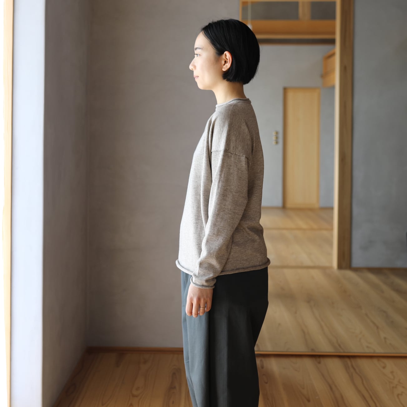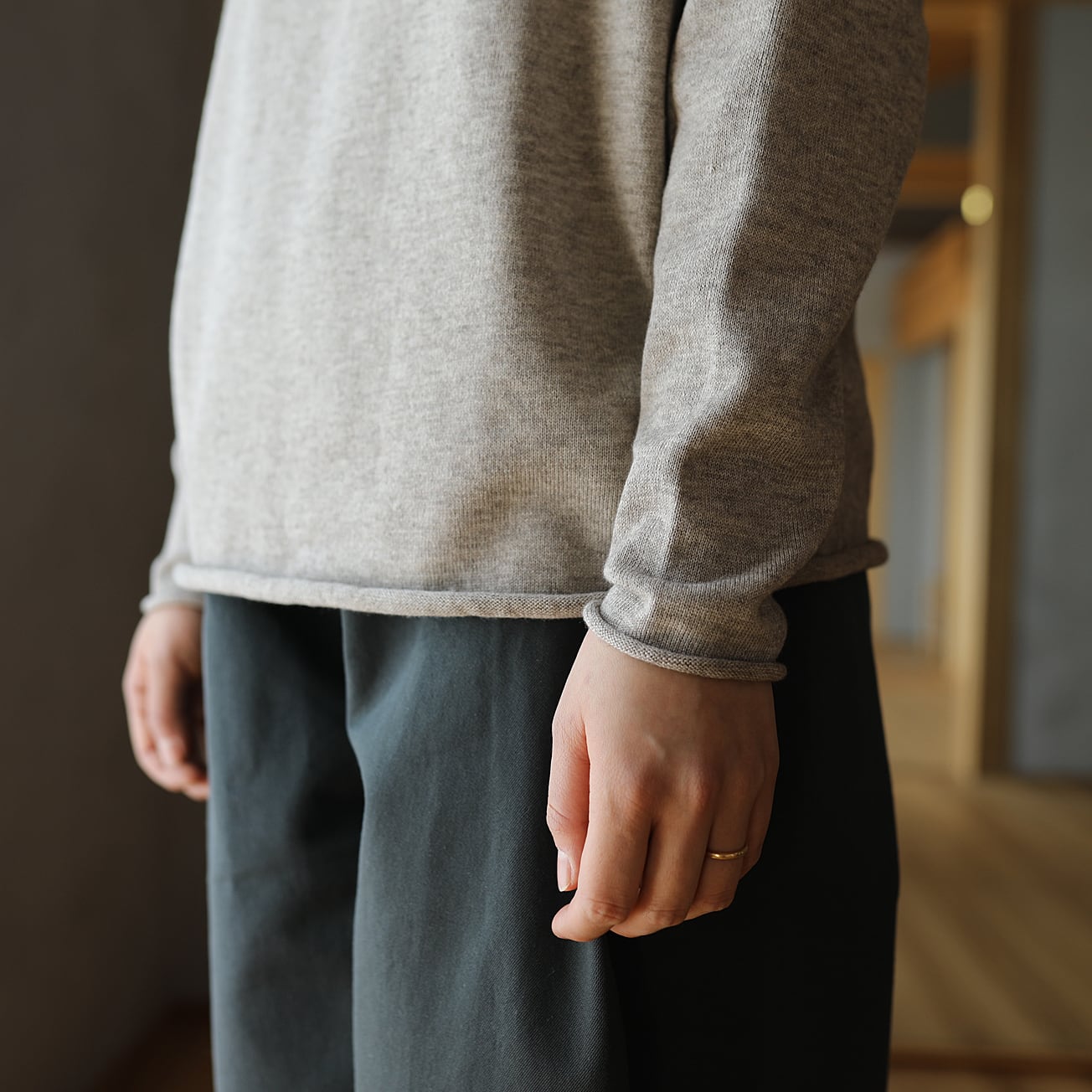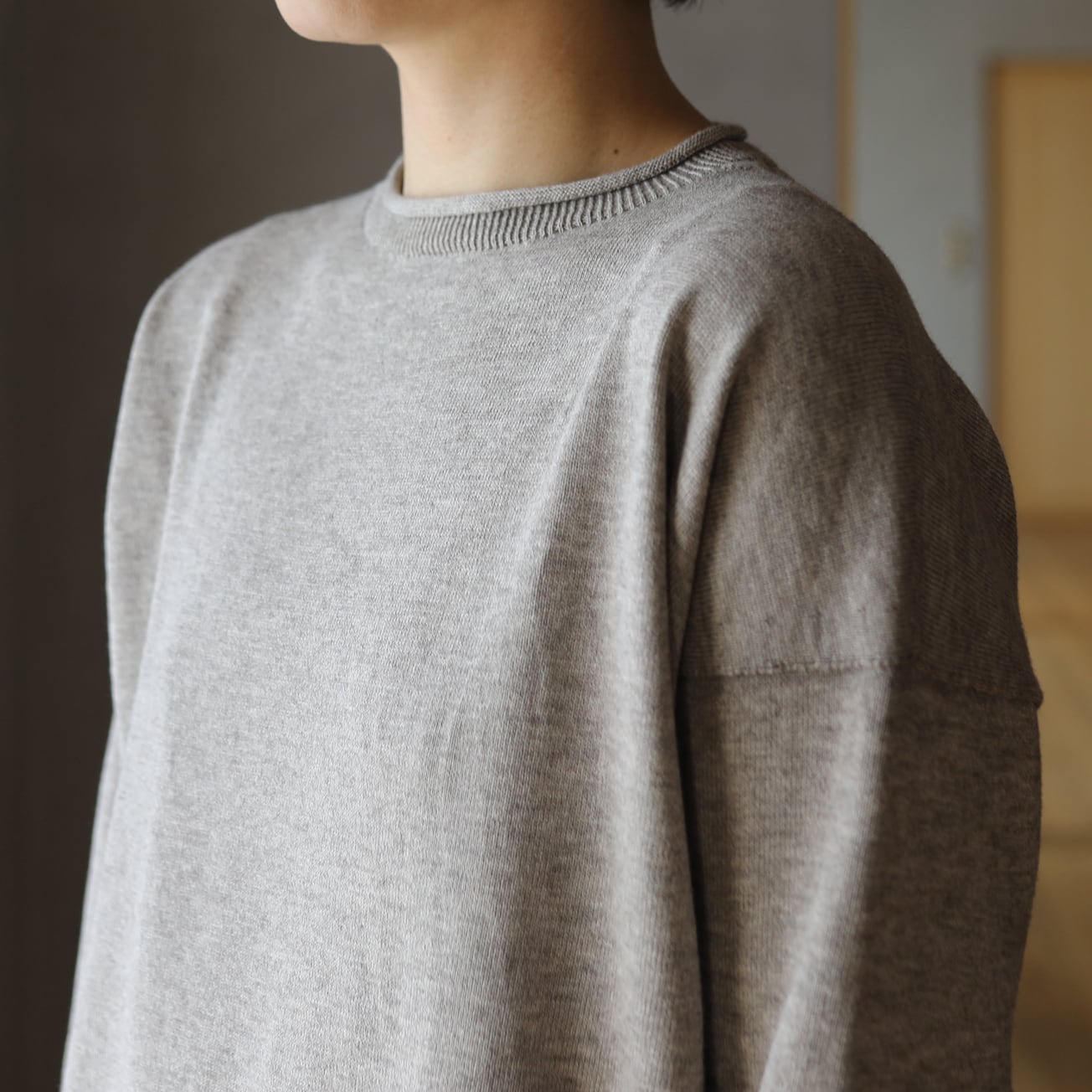 昔ながらのフィッシャーマンセーターをモチーフに、シンプルな形ながら立ち上げた襟ぐりやくるりとなった襟、袖口、裾が特徴です。