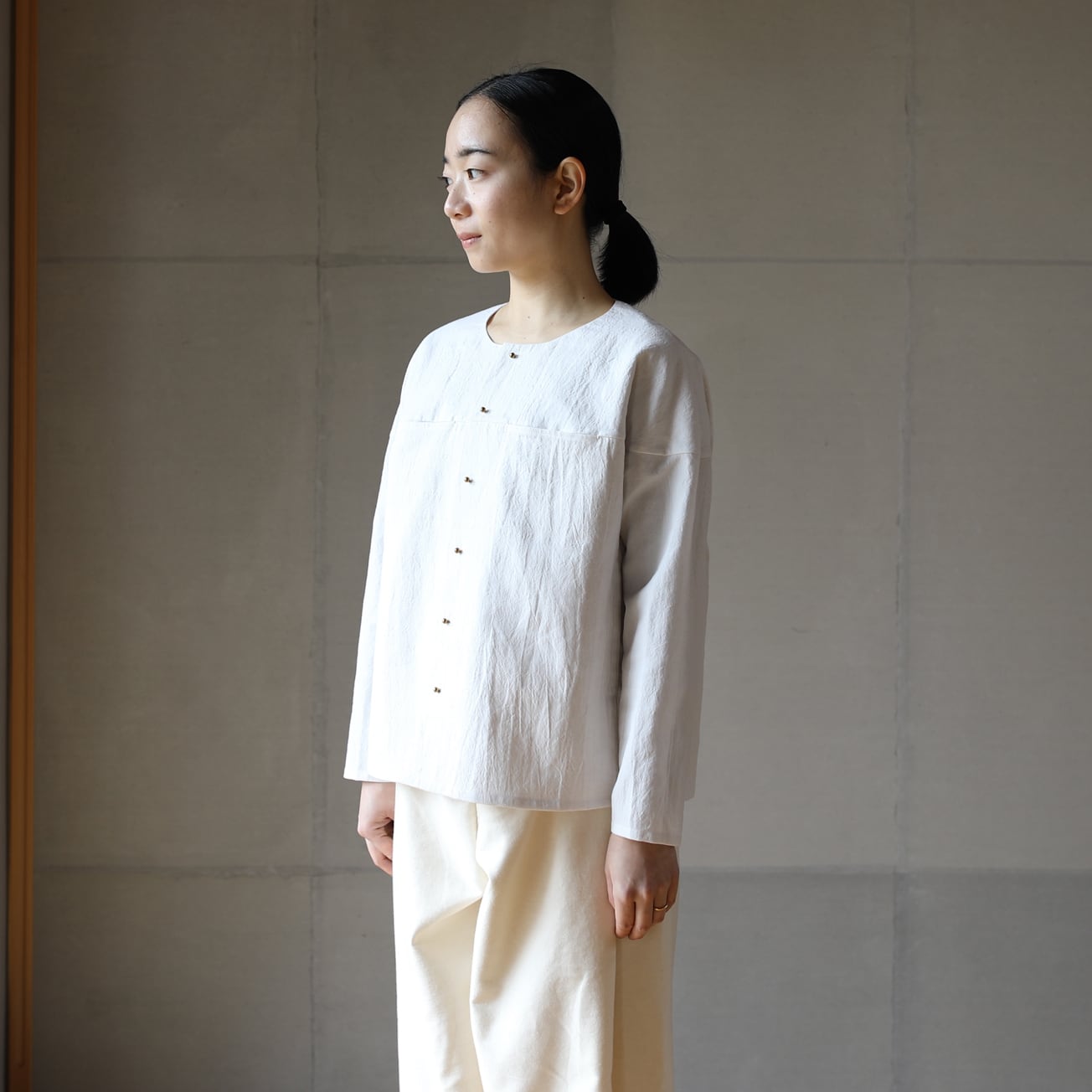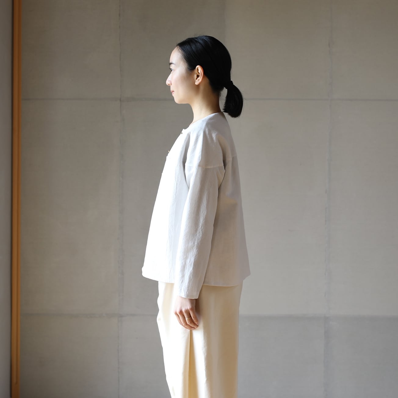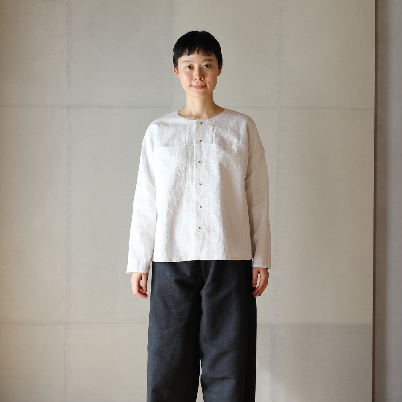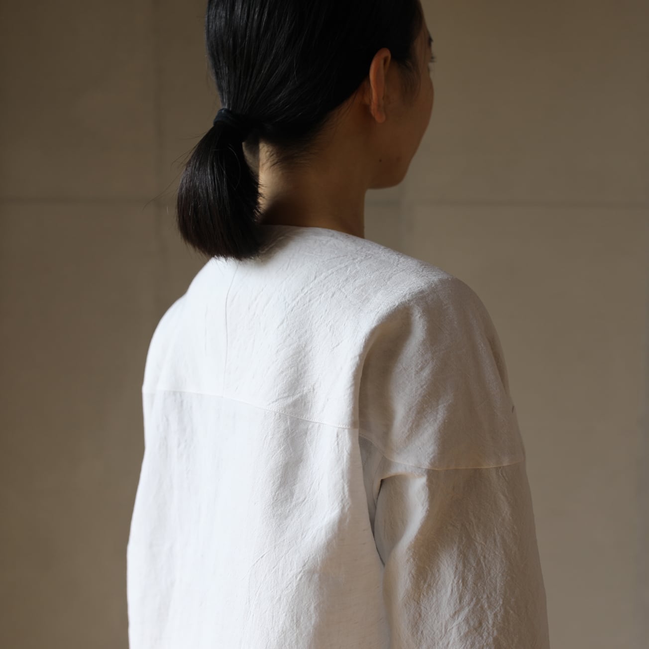 強撚糸を使用しているため、生地表面がシャリっとした肌触りと軽さ、白の中にリネンの生成りの糸が混ざった色合いが魅力の布。