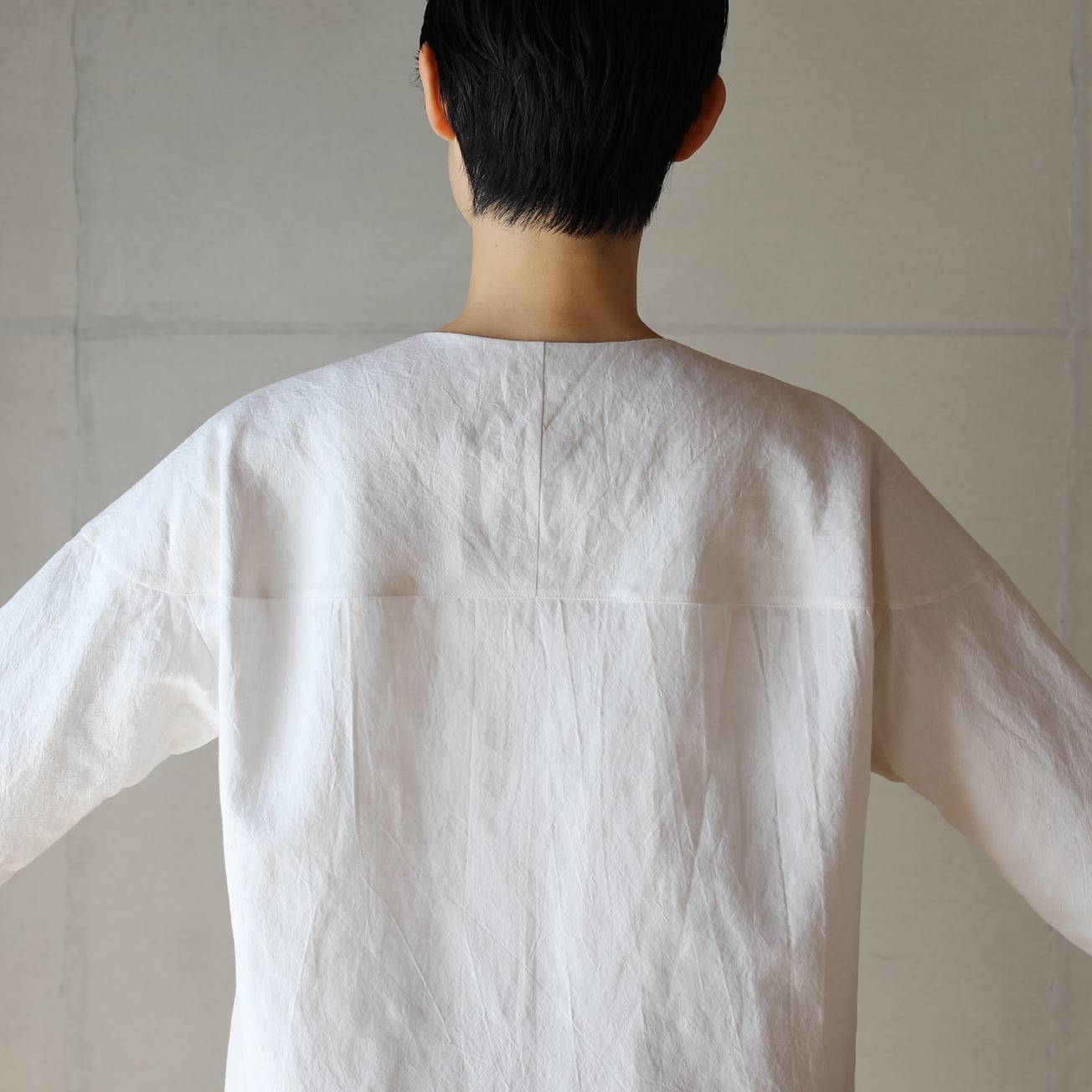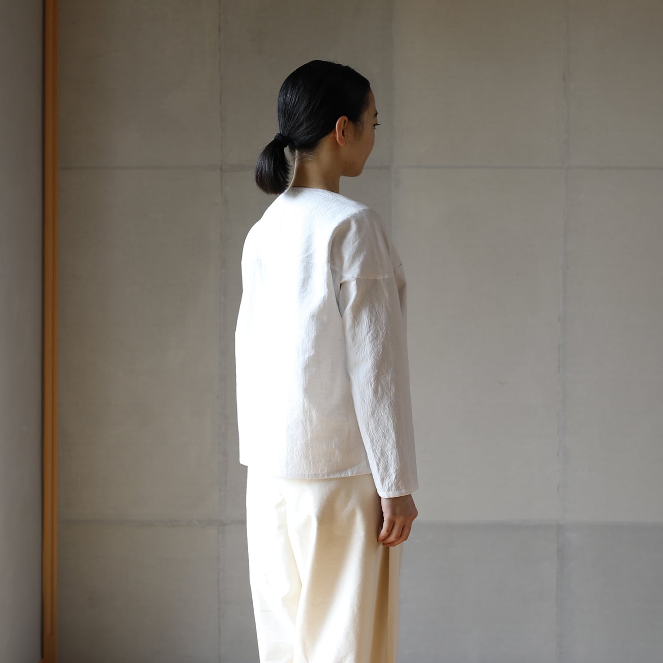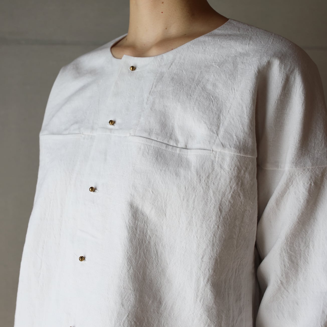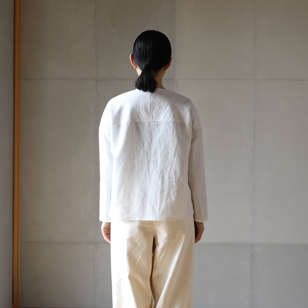強撚糸を使用しているため、生地表面がシャリっとした肌触りと軽さ、白の中にリネンの生成りの糸が混ざった色合いが魅力の布。
