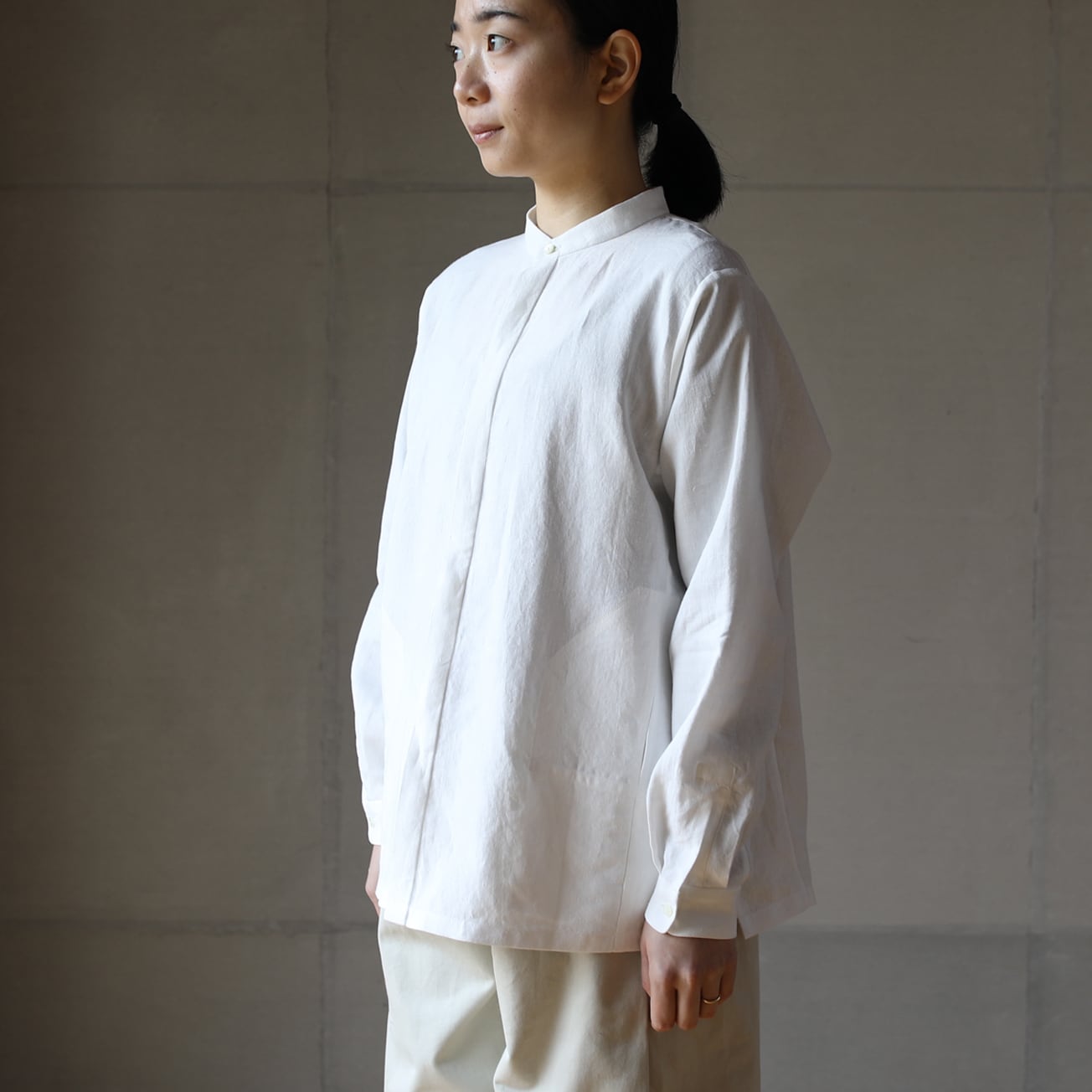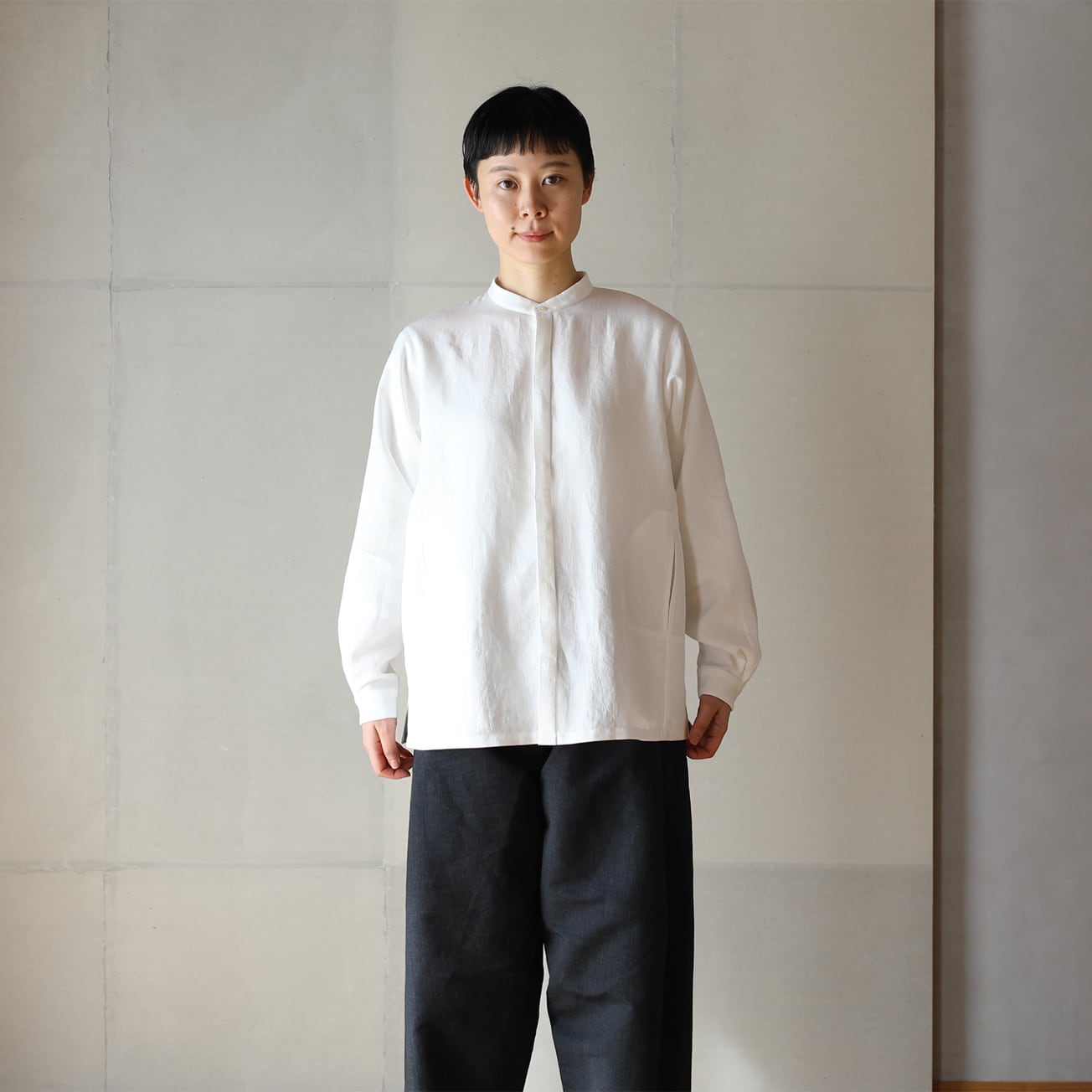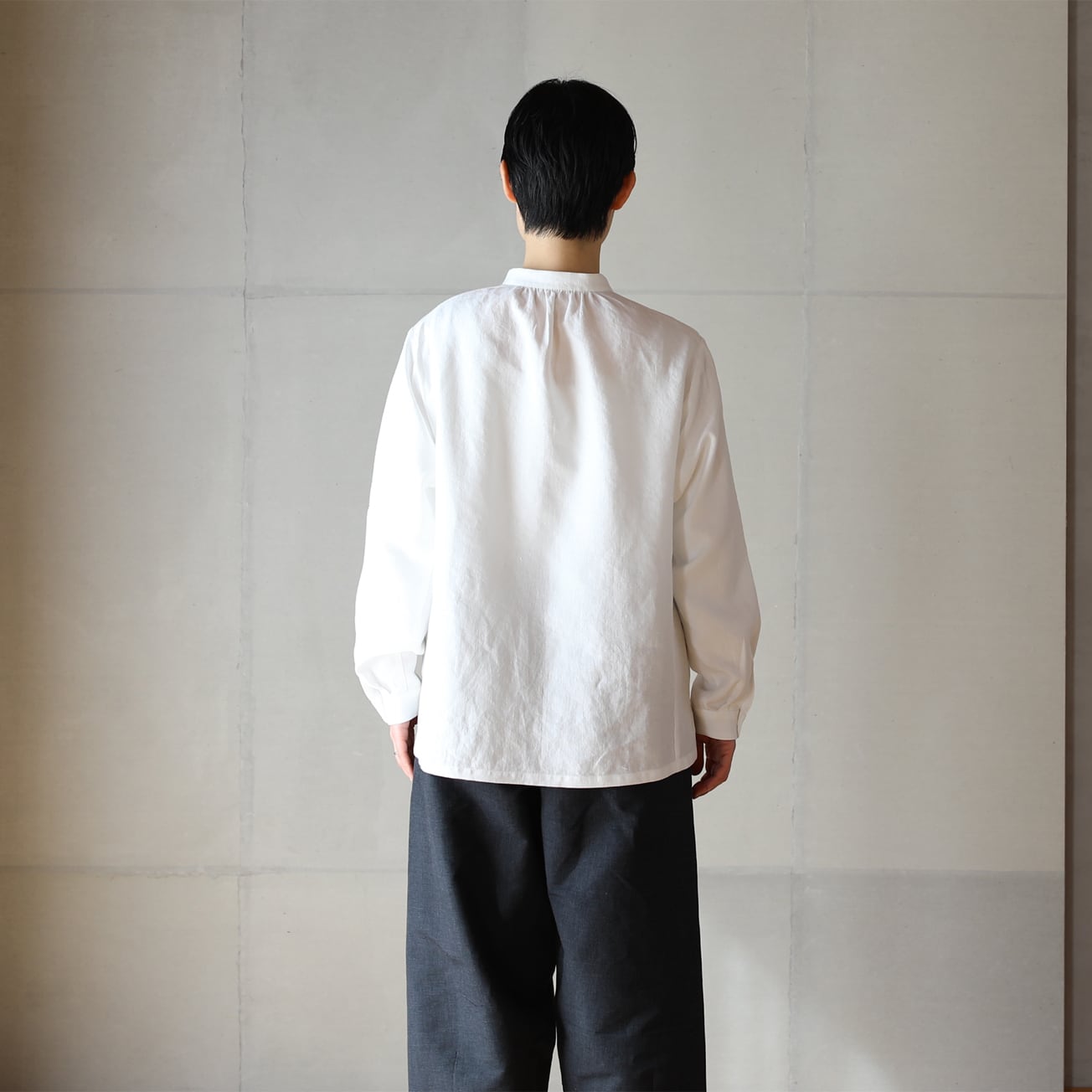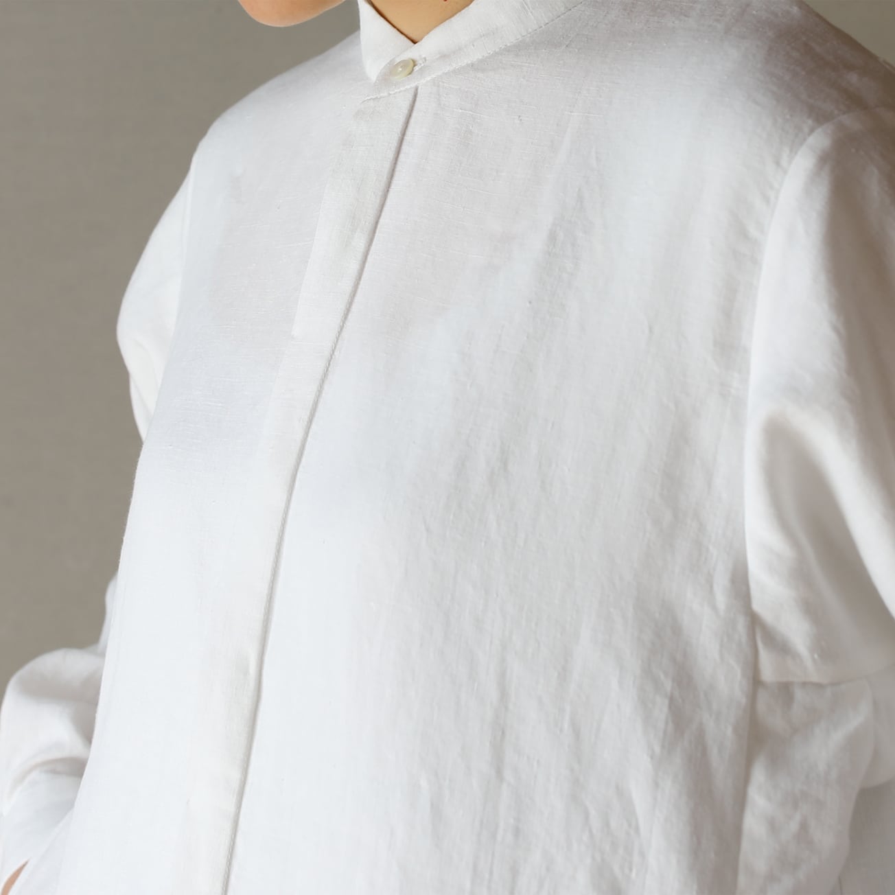 比翼仕立てのバンドカラーの長袖シャツ。