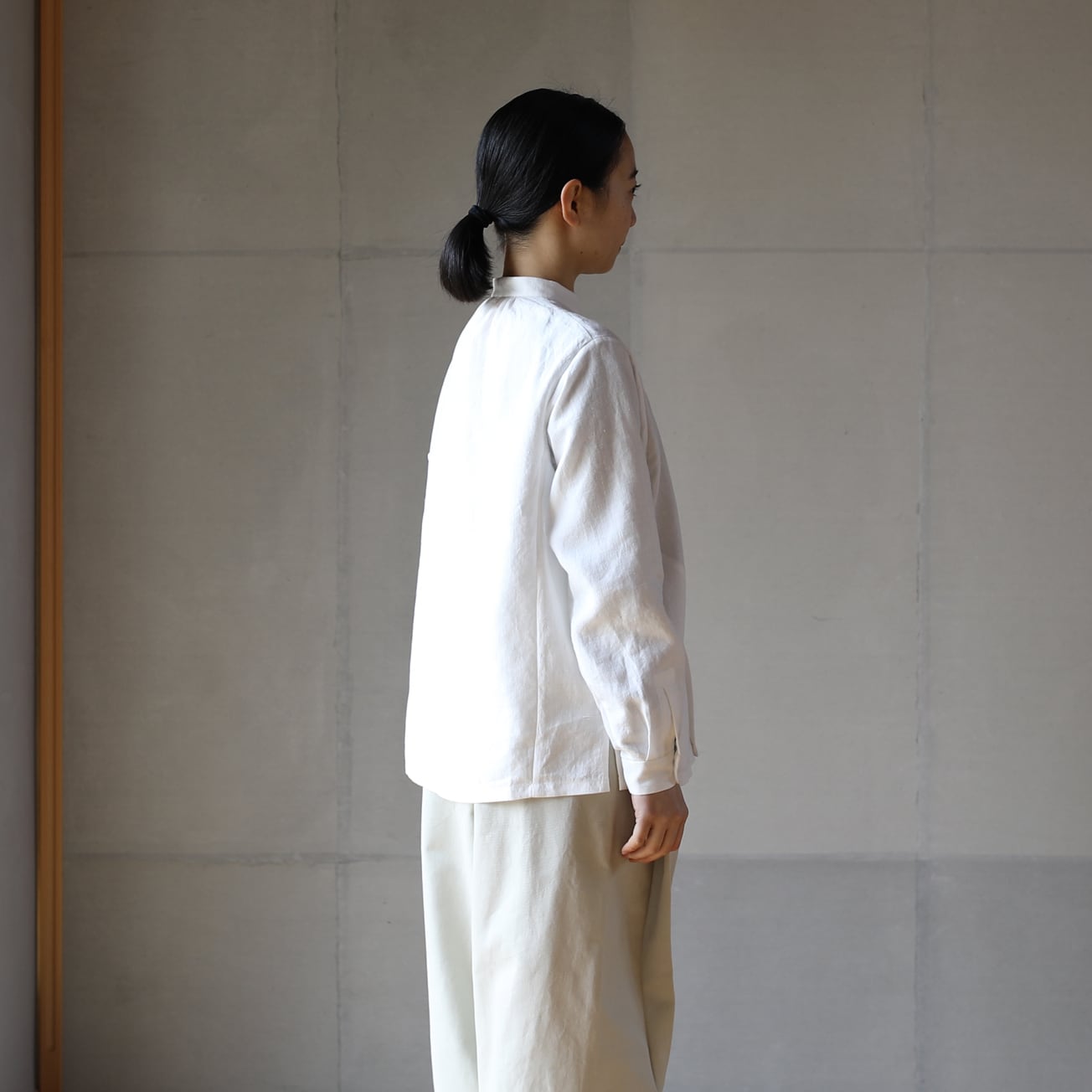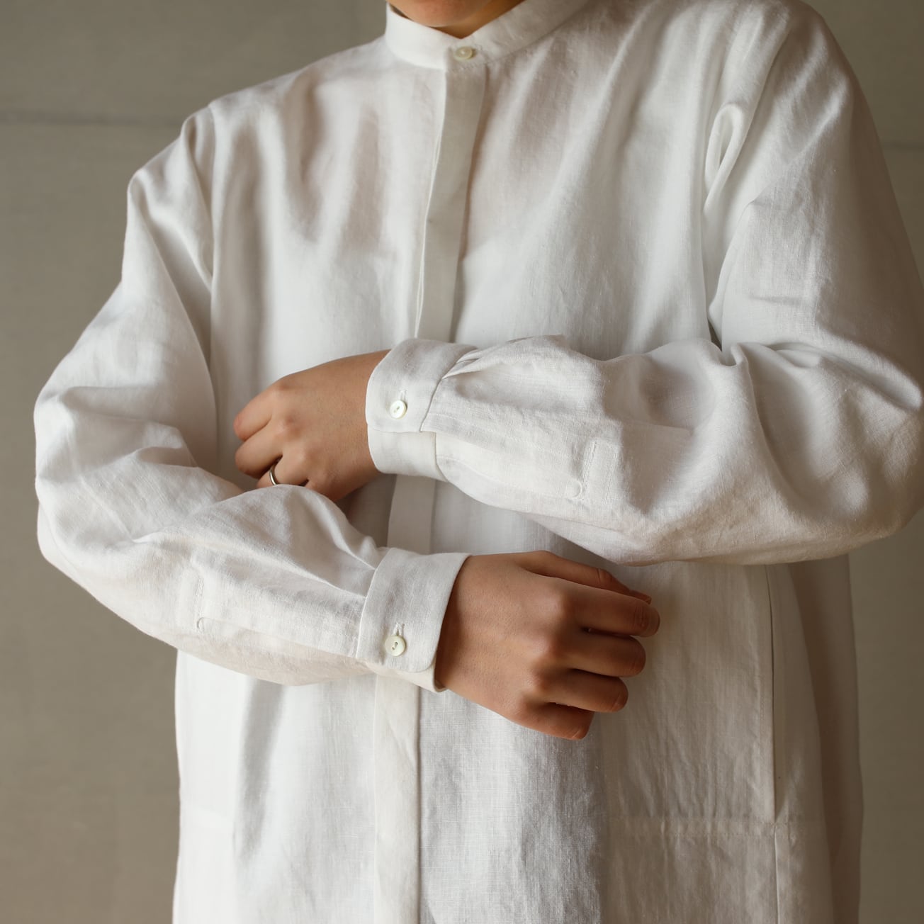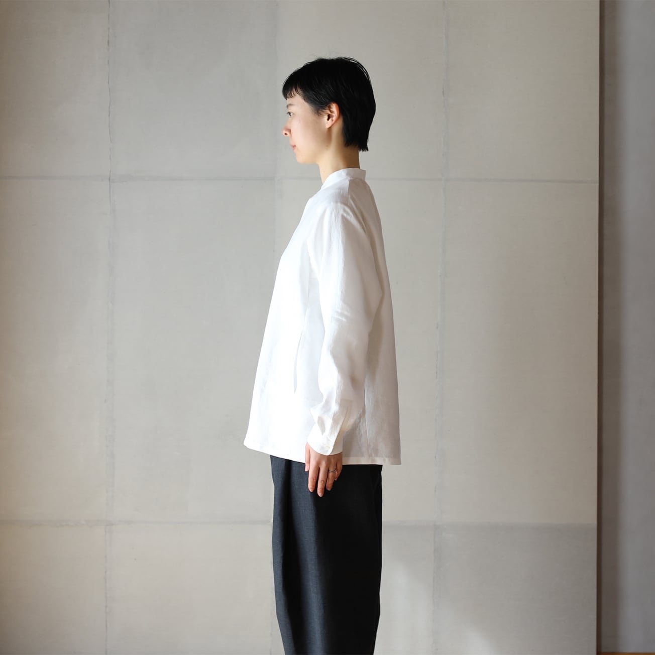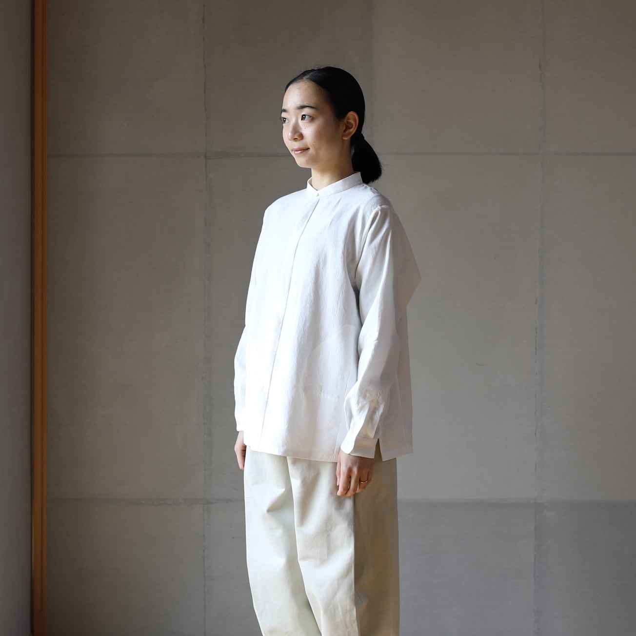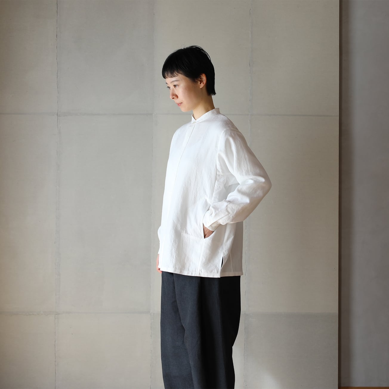比翼仕立てのバンドカラーの長袖シャツ。
