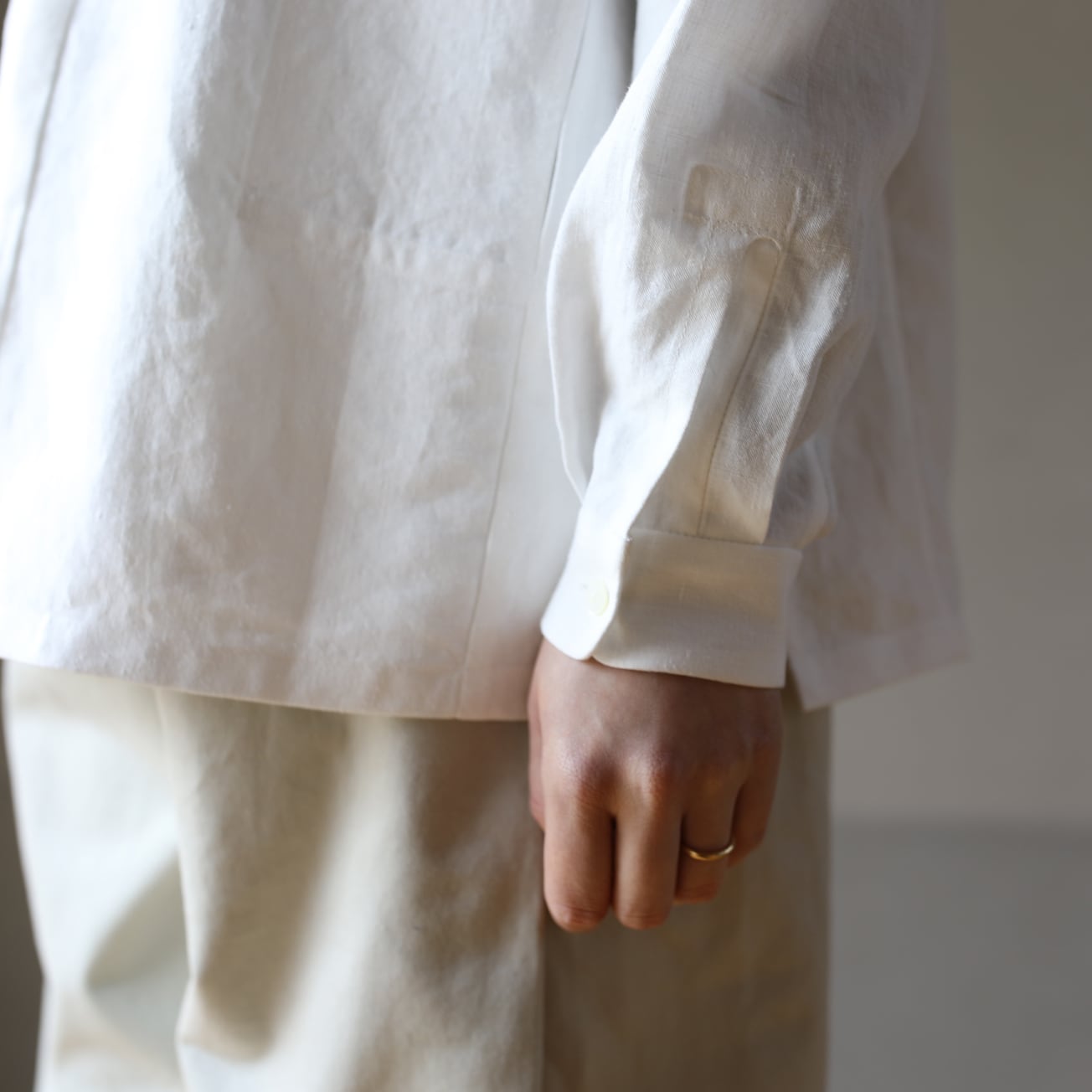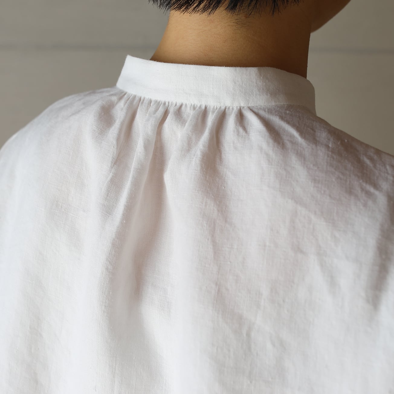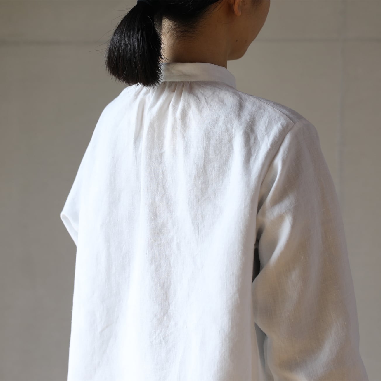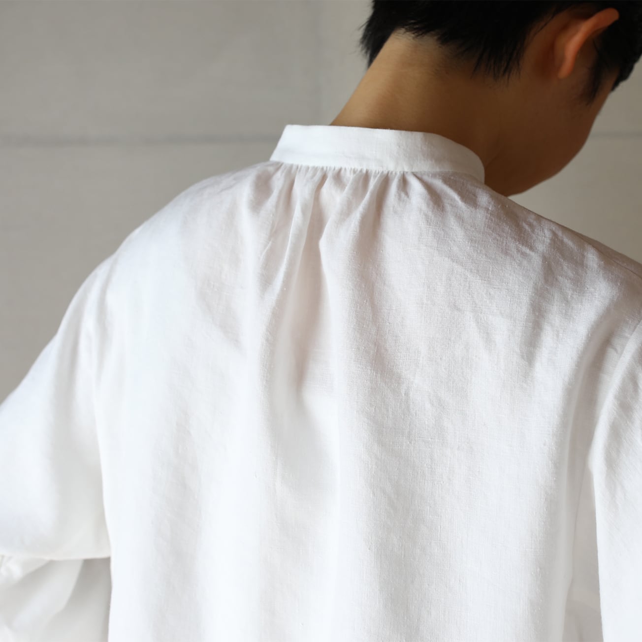 比翼仕立てのバンドカラーの長袖シャツ。