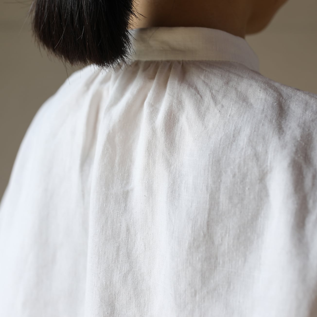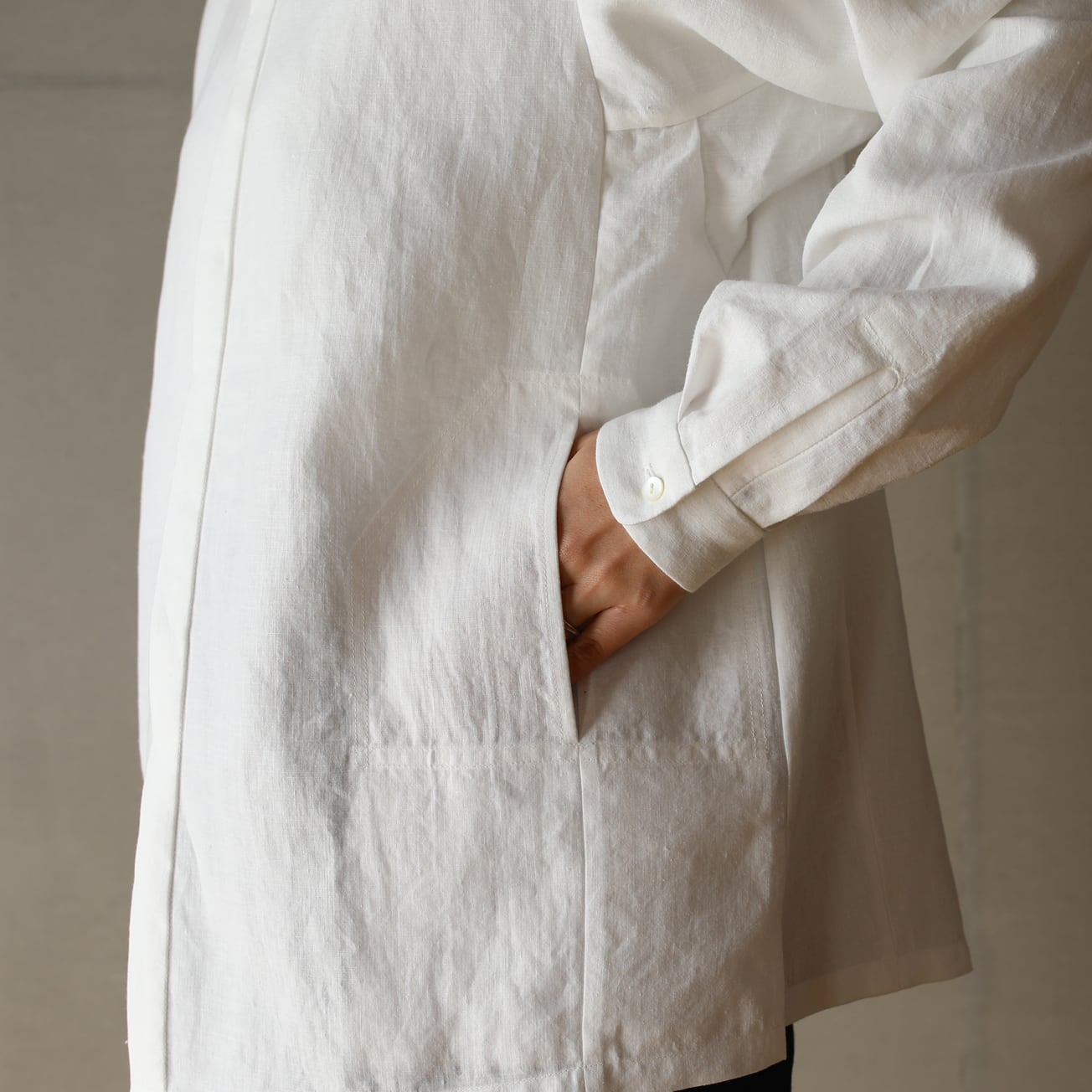 一見シンプルな形ですが、脇のマチや両サイドのポケット、後襟付け根のギャザー、カフスなどところどころに細かいディテールを入れています。