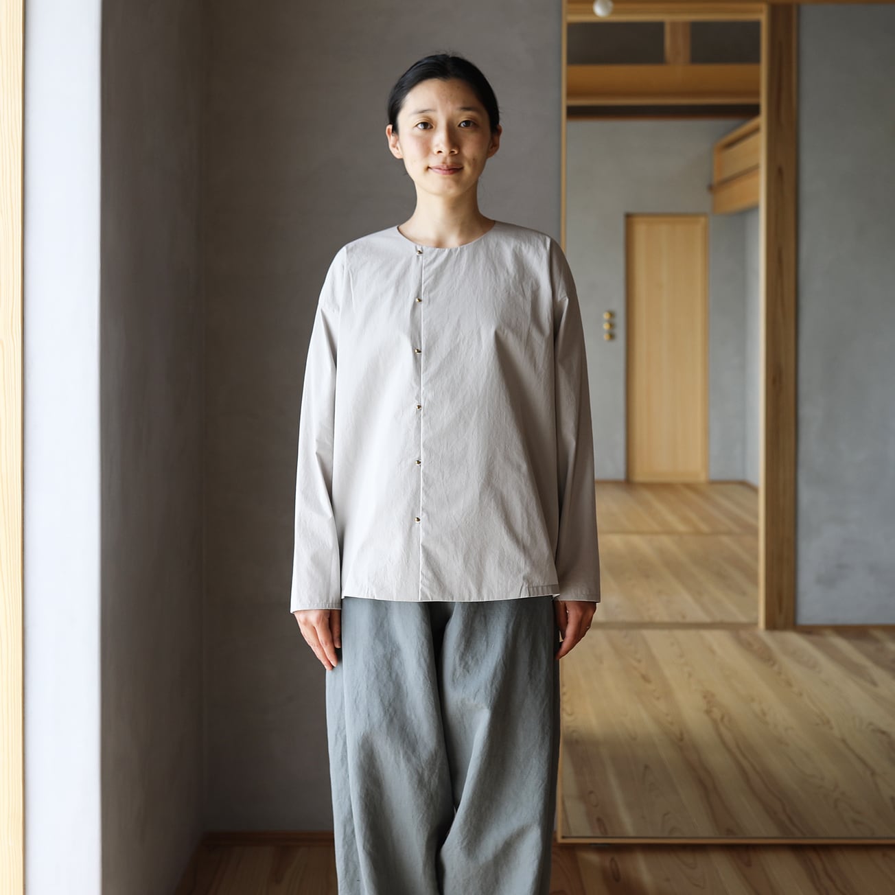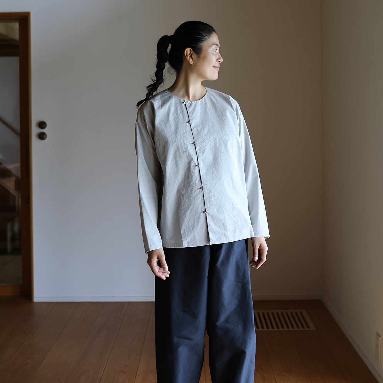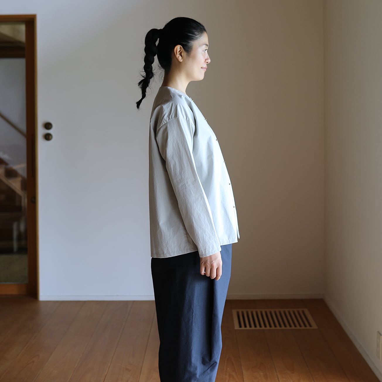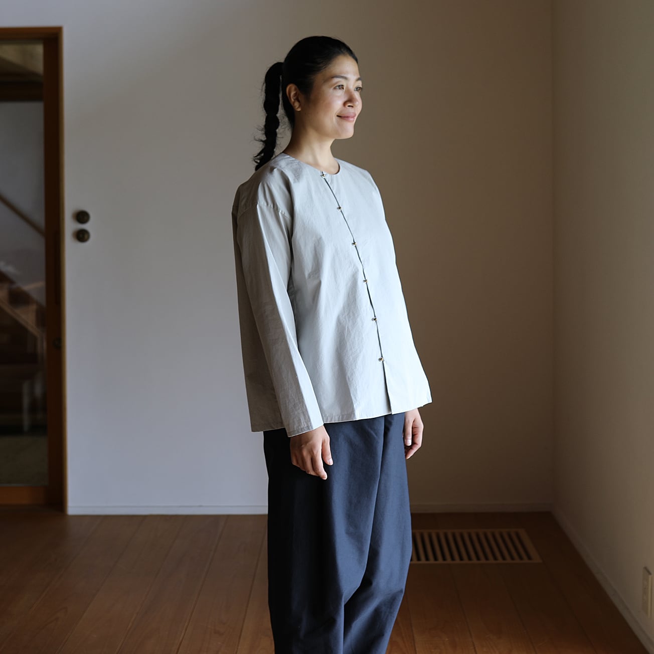 シンプルで着やすく合わせやすく、ボタンの位置を少しサイドにずらすことで特長のあるシャツになりました。