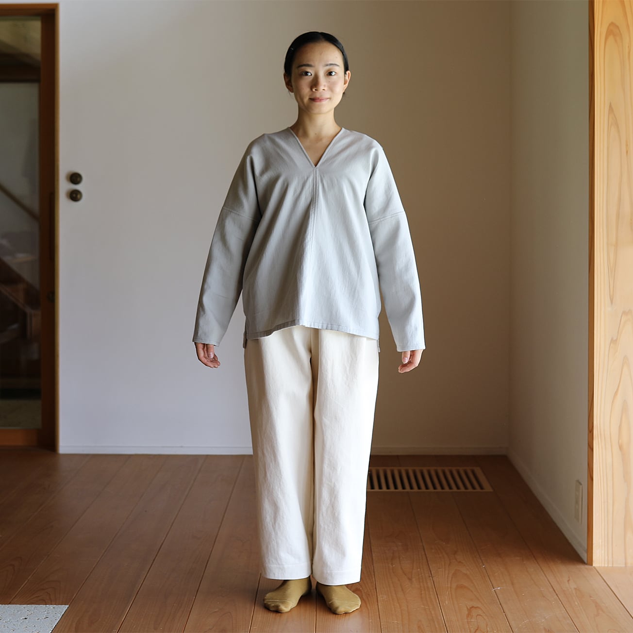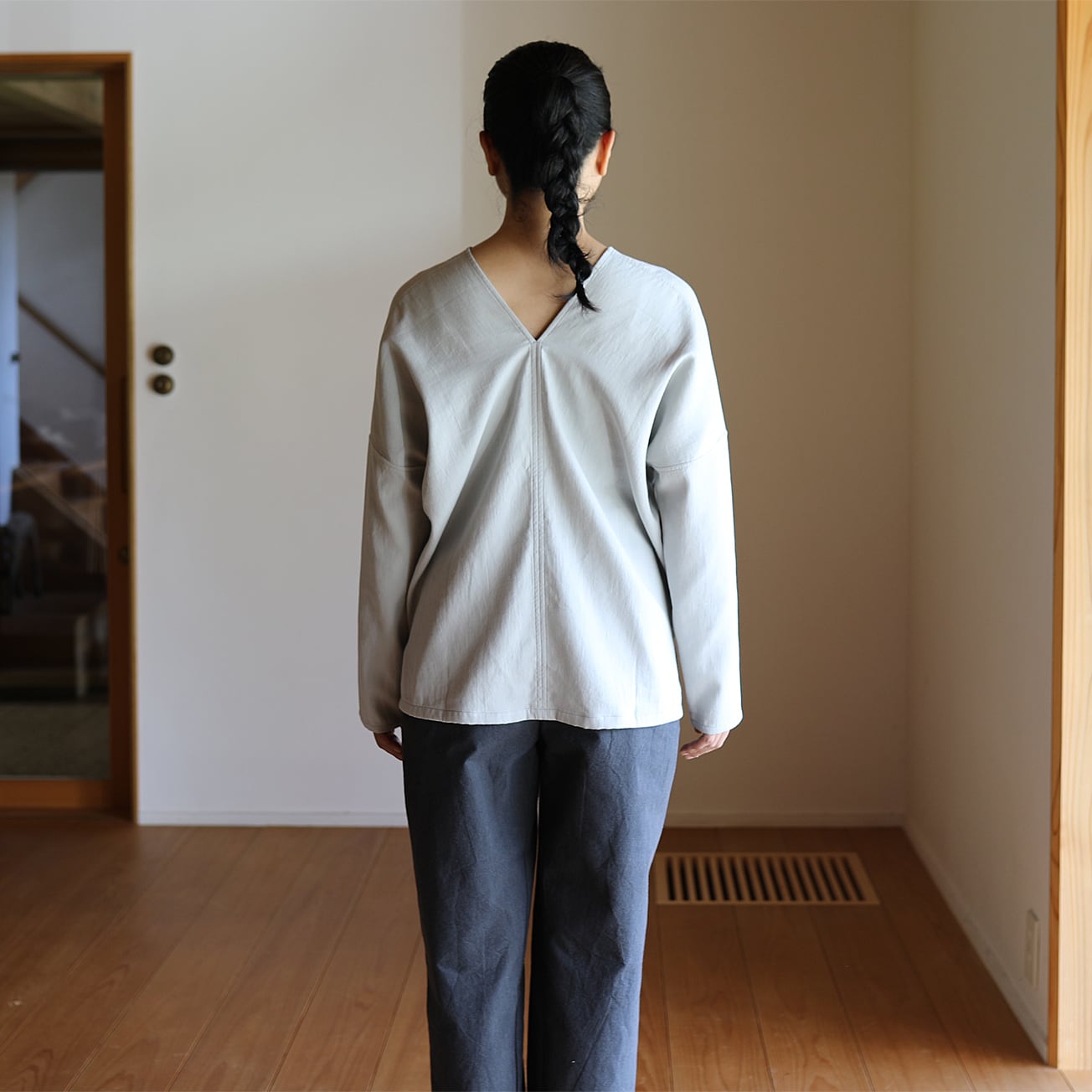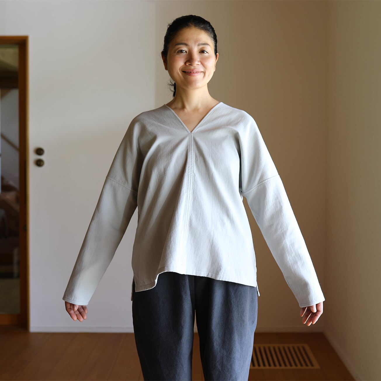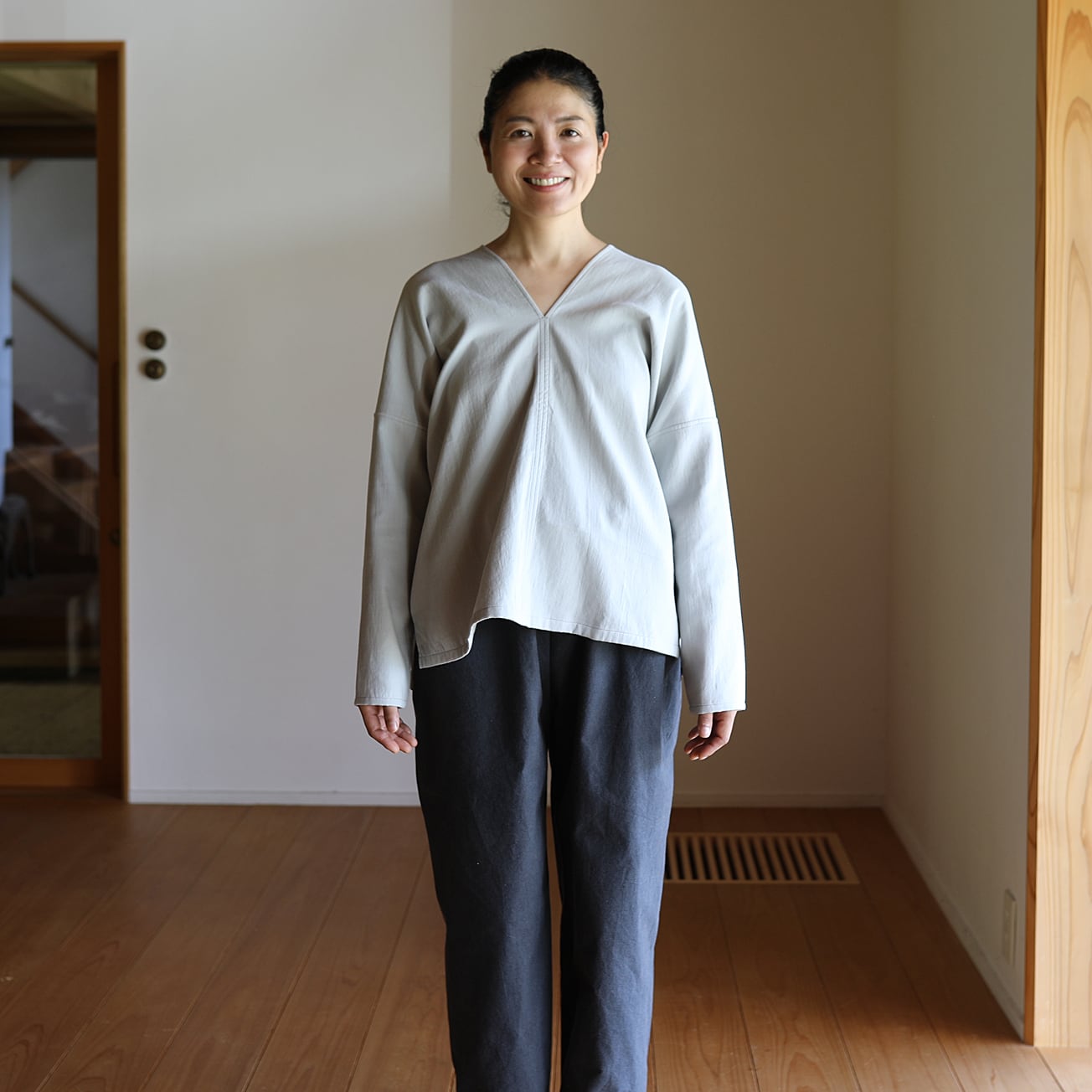 後ろ身頃は丈を長くしているため、しゃがんでも背中が出ないようにしました。