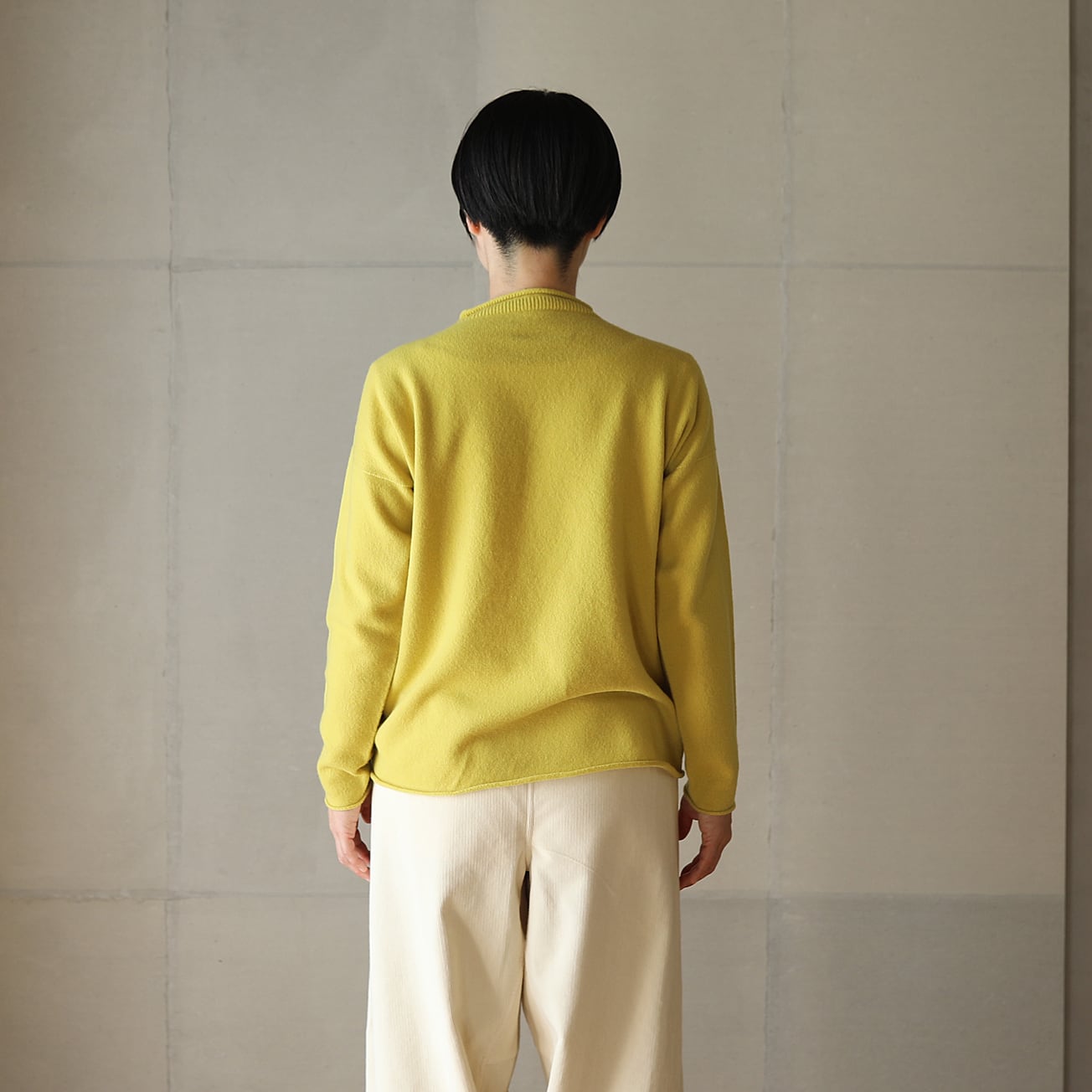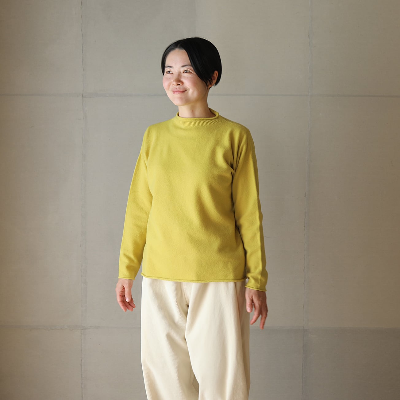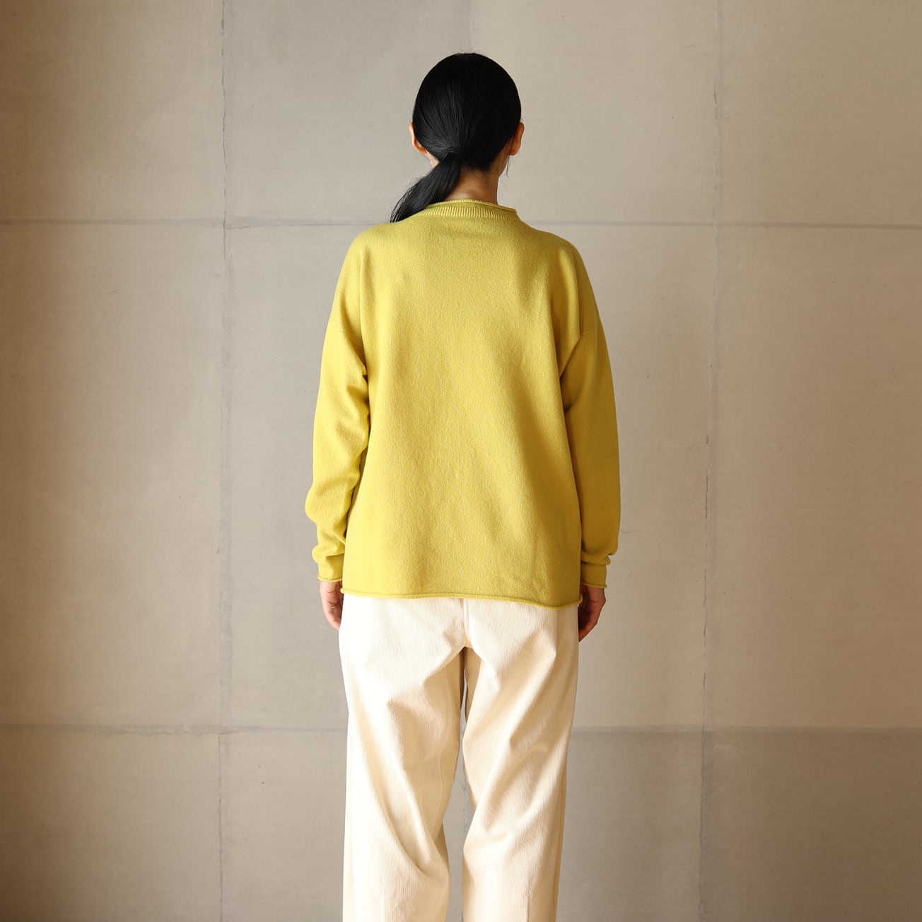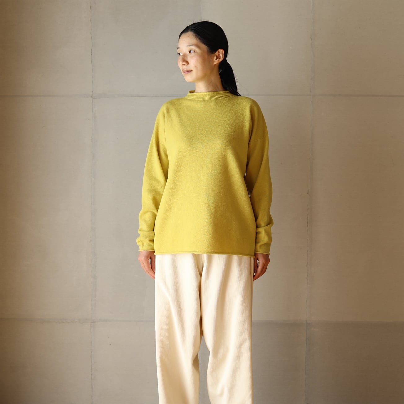 昔ながらのフィッシャーマンセーターをモチーフに、シンプルな形ながら立ち上げた襟ぐりやくるりとなった襟、袖口、裾が特徴です。