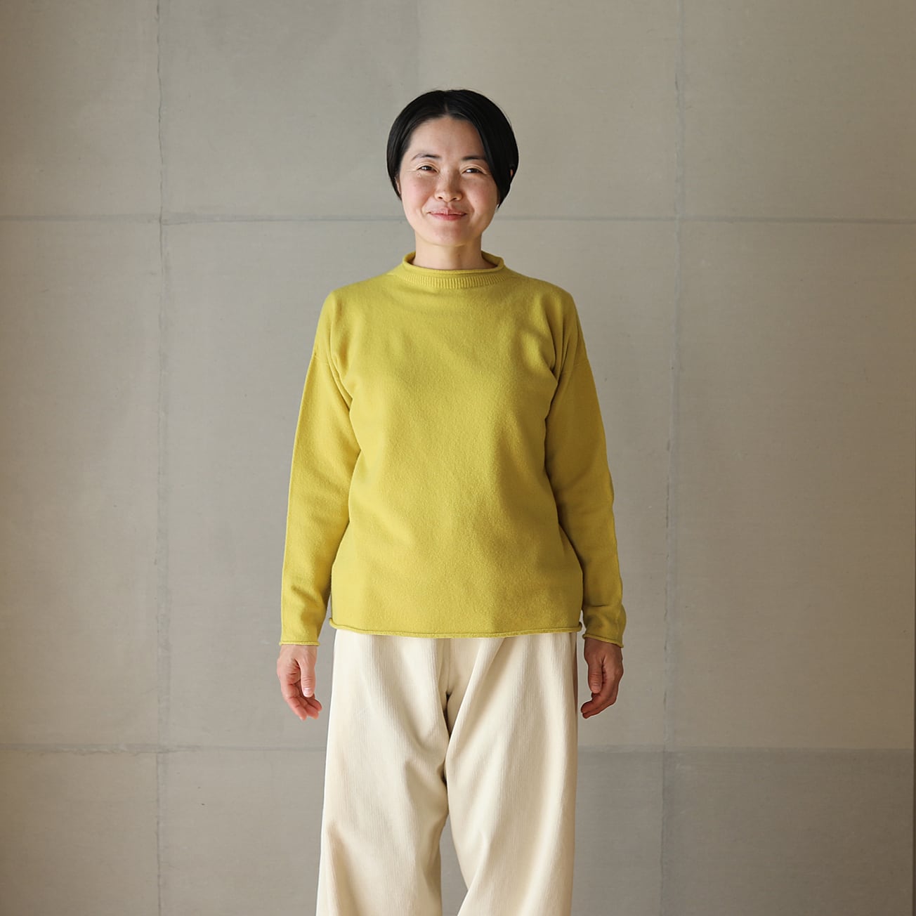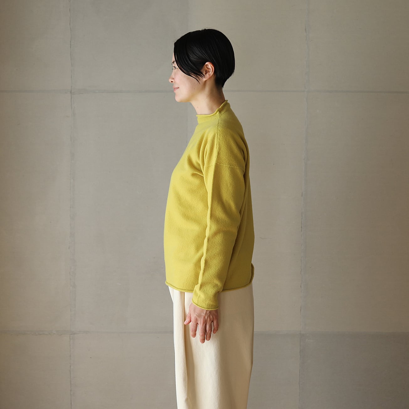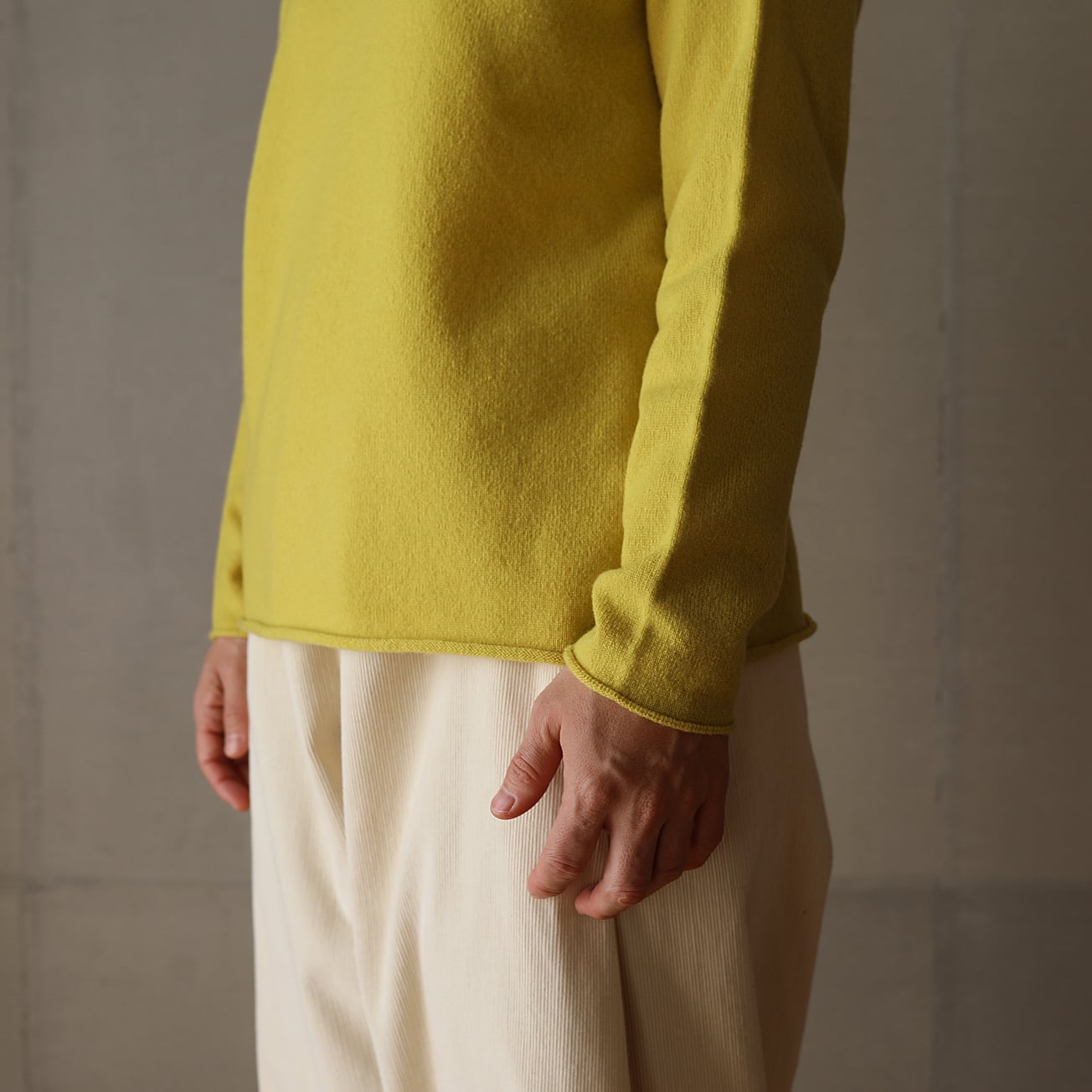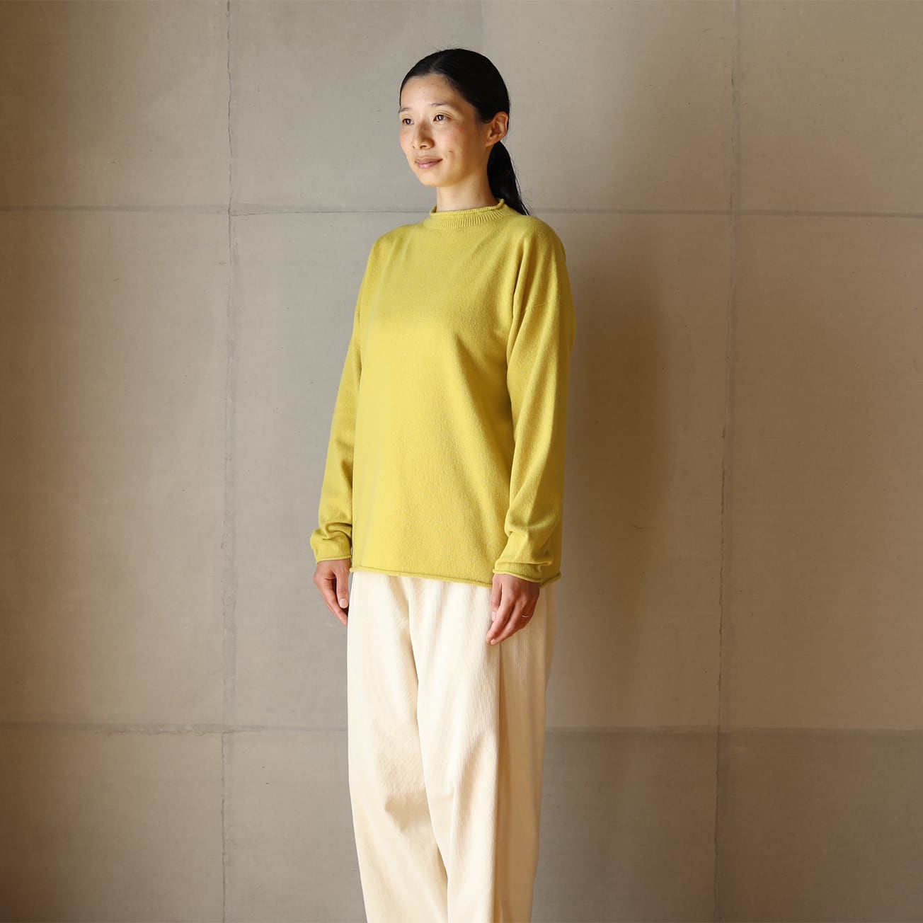 昔ながらのフィッシャーマンセーターをモチーフに、シンプルな形ながら立ち上げた襟ぐりやくるりとなった襟、袖口、裾が特徴です。
